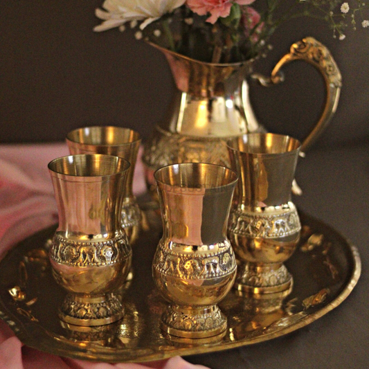 Royalty Inspired Brass Water Jug Set | 6 Tall Glasses, Serving Tray and Jug | Gift Box | Festive Gifting